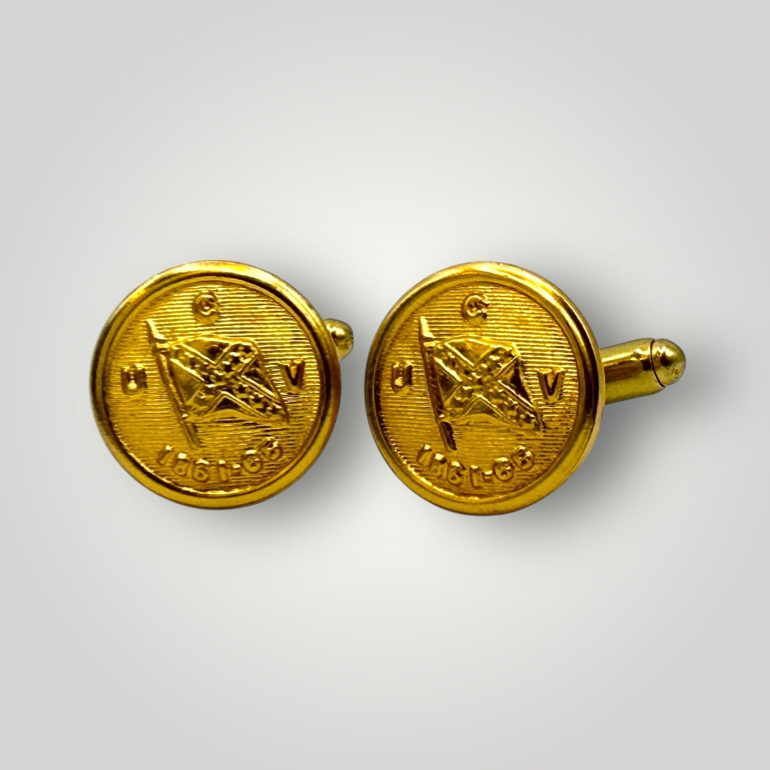 Acknowledge a complex chapter in American history with these vintage Confederate emblem buttons and cufflinks, originally crafted by Waterbury Button Company during the Civil War era. The ‘U.C.V.’ stands for United Confederate Veterans organization that emerged after the American Civil War. This vintage design in the Waterbury Button archives represents the historical reality of America's Civil War period and serve as educational reminders of our nation's past. Available as gold or silver cufflinks and button sets.