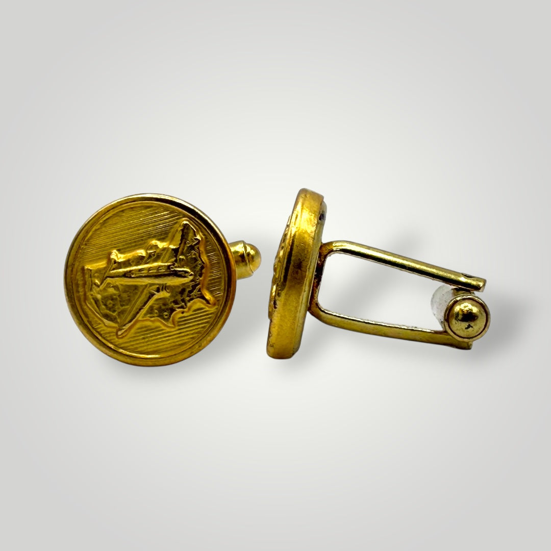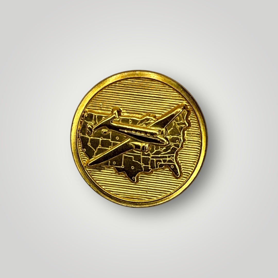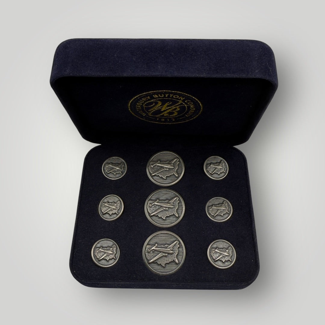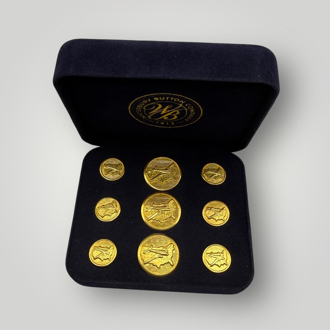 Take flight with these inspiring Cross Country Flight buttons and cufflinks, featuring an early 20th century airplane design flying over the United States. This archived Waterbury Button design celebrates the pioneering spirit of American aviation and the courage of early aviators who opened the skies for cross-country travel. Available as gold or silver cufflinks and button sets.