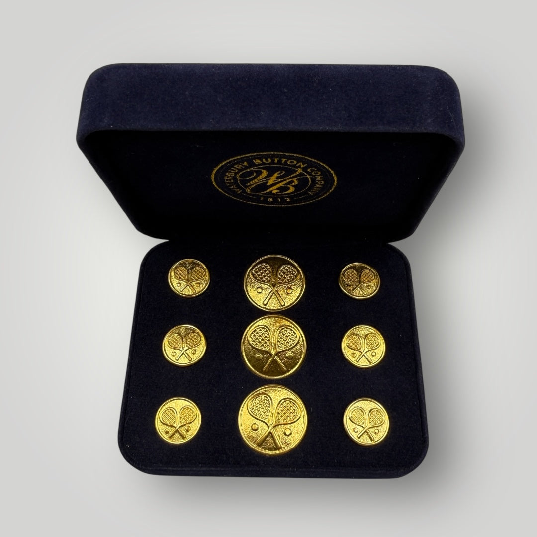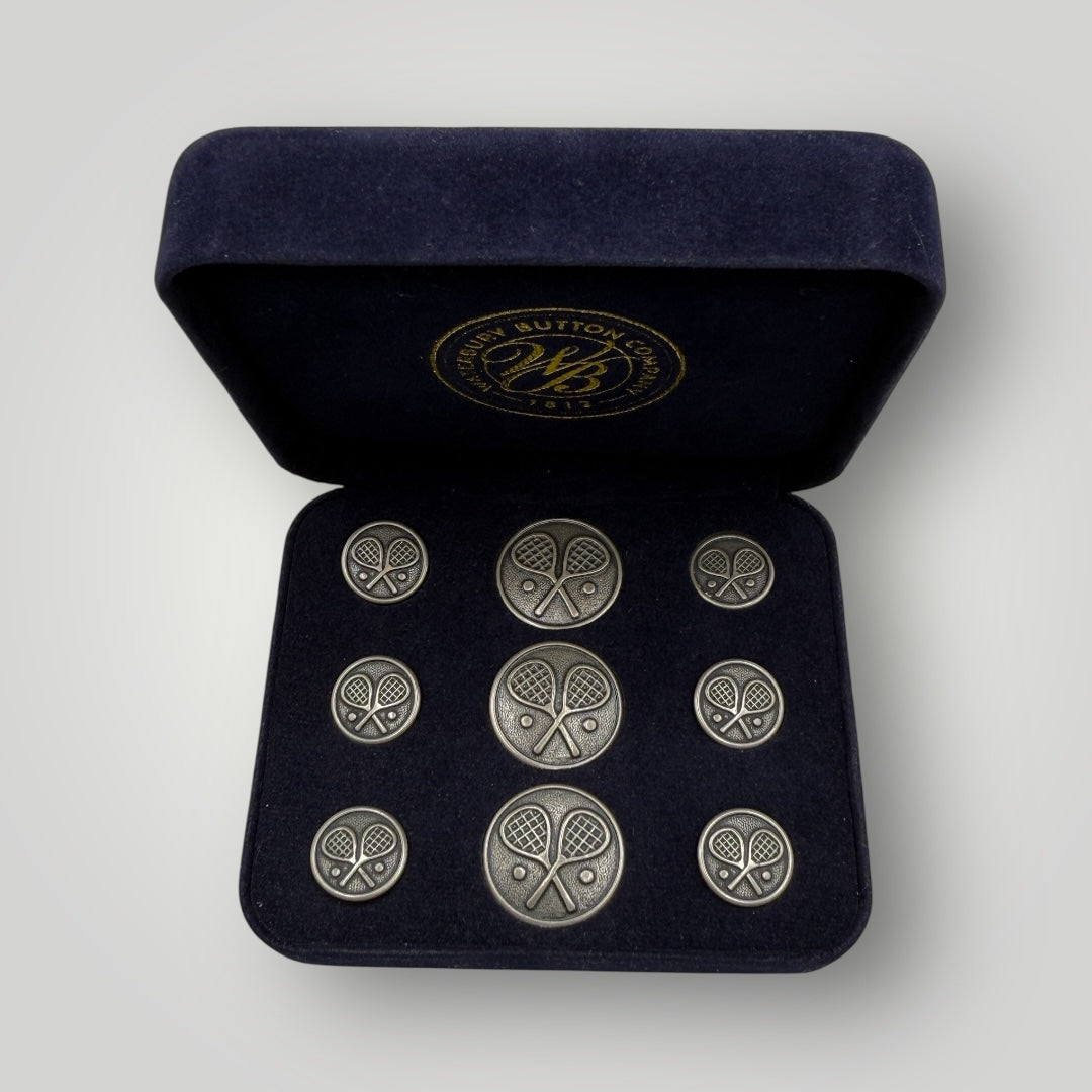 Serve up elegance with these sophisticated Crossed Tennis Rackets buttons and cufflinks, perfect for tennis aficionados and athletes. This elegant design celebrates the precision, athleticism, and gentleman's sport tradition that defines tennis culture, making it an ideal accessory for both on-court competition and off-court elegance. Available as gold or silver cufflinks and button sets.