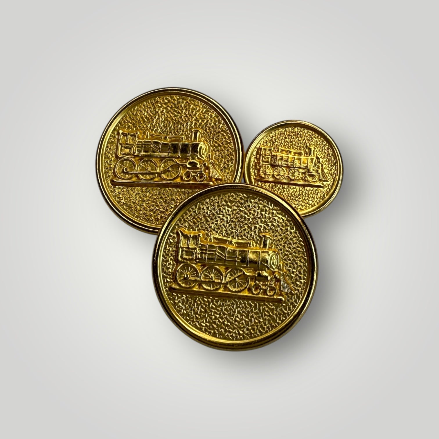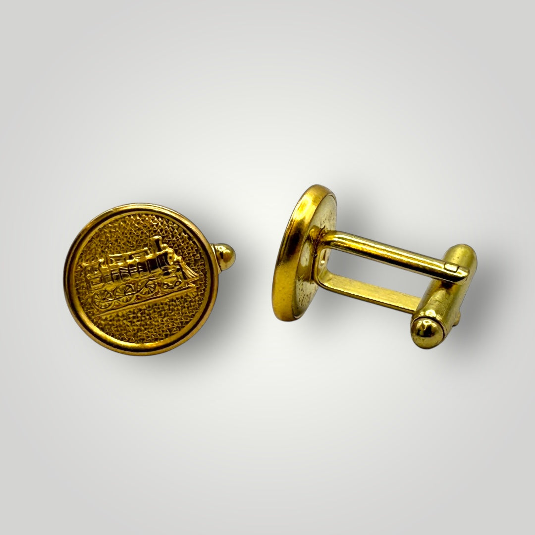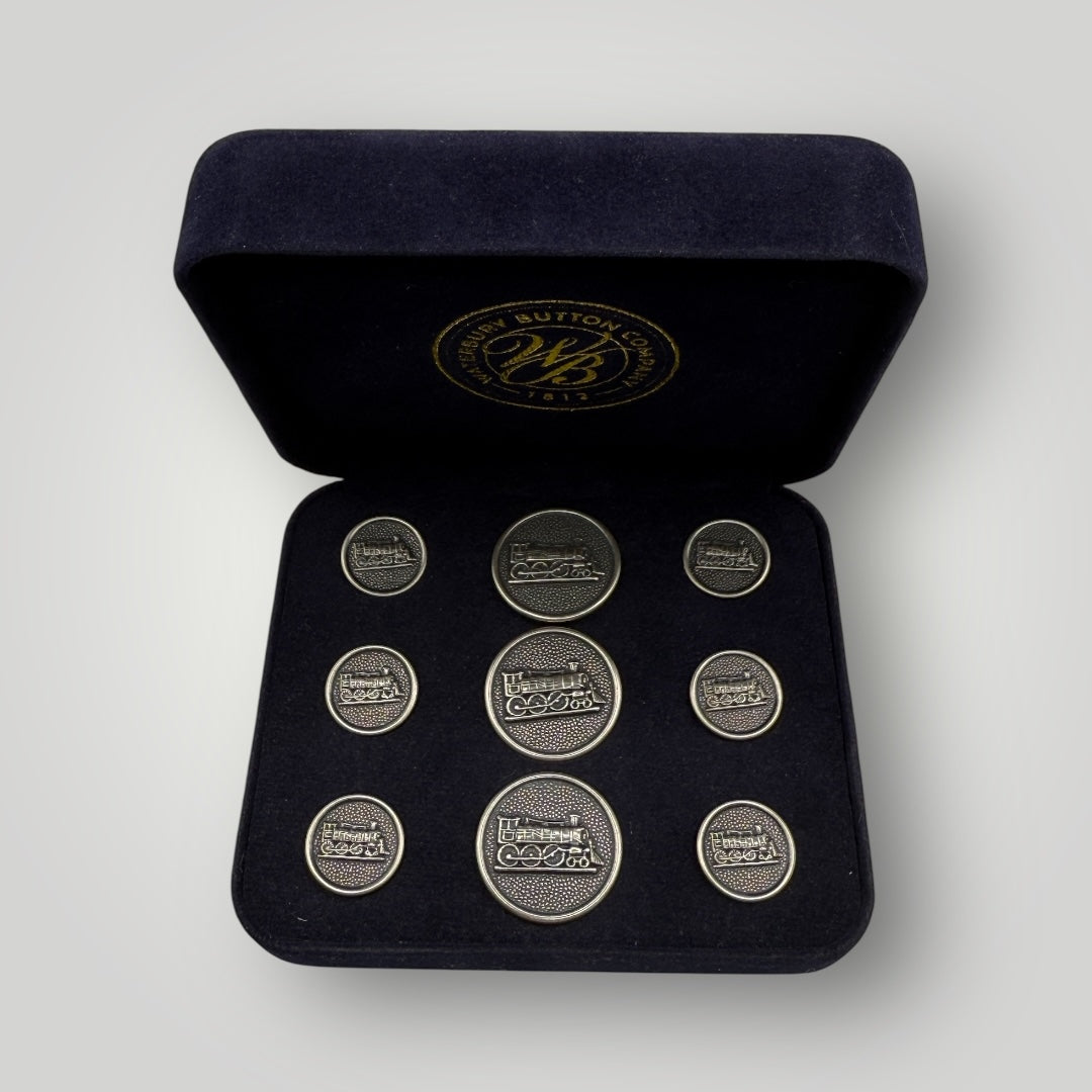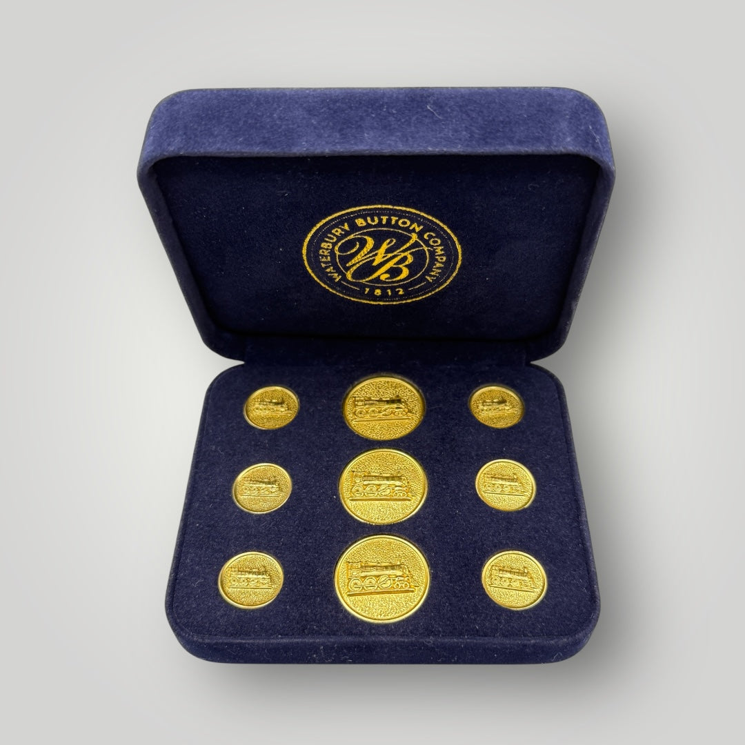 All aboard for style with these vintage Locomotive buttons and cufflinks, celebrating the golden age of rail transportation that connected America from coast to coast. The Waterbury Button Company was founded 18 years before the first public train service in the United States, and has since been a long-standing supplier to railway uniforms and the evolution across the country to this day. This handcrafted original design honors the steam locomotives that powered American expansion and industrial growth, making it perfect for railroad enthusiasts and those who appreciate America's transportation heritage. Available as gold or silver cufflinks and button sets.
