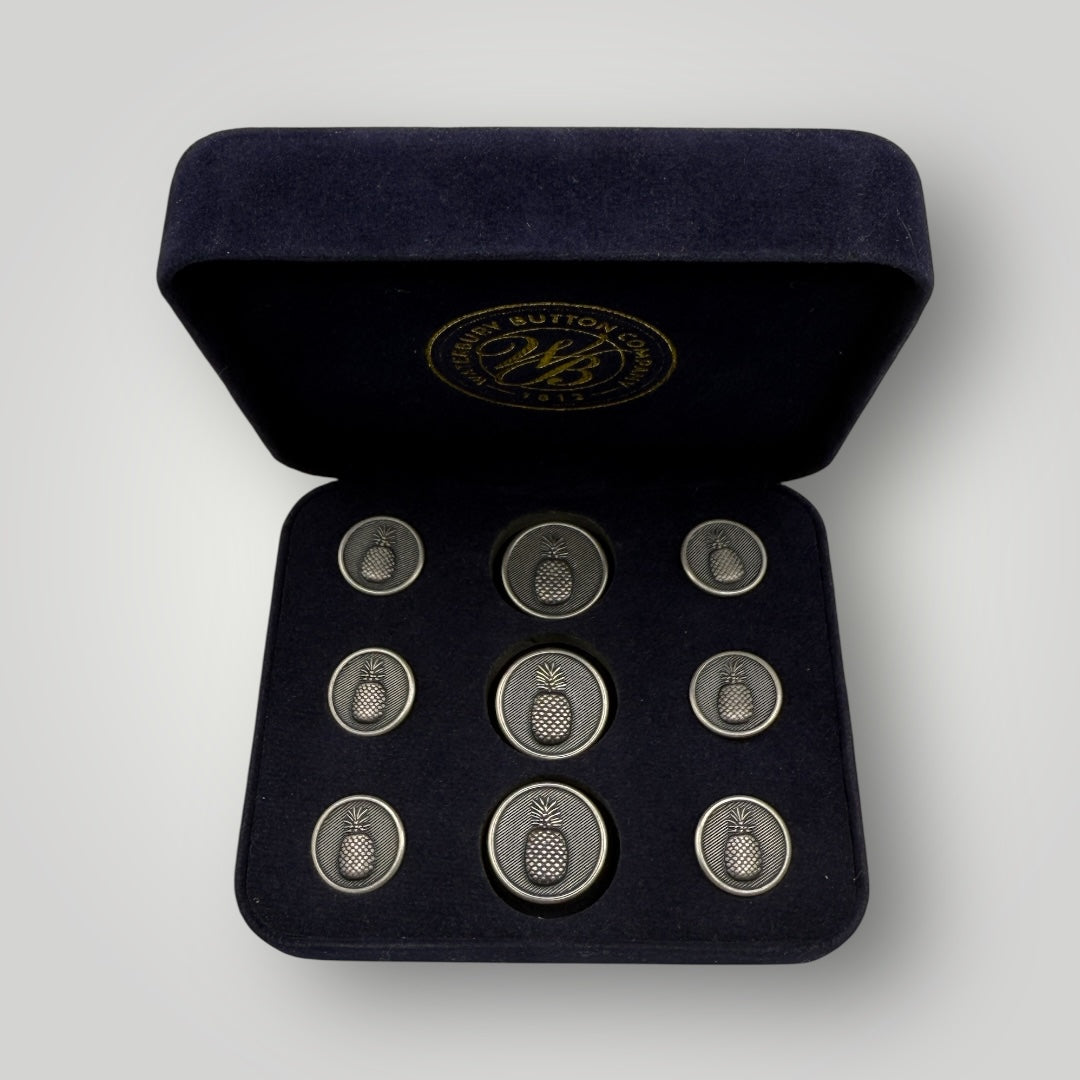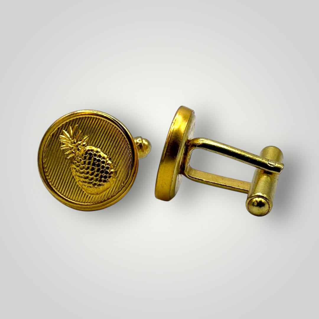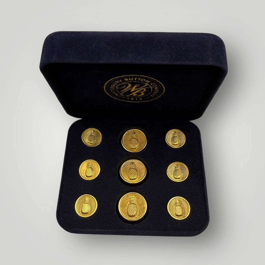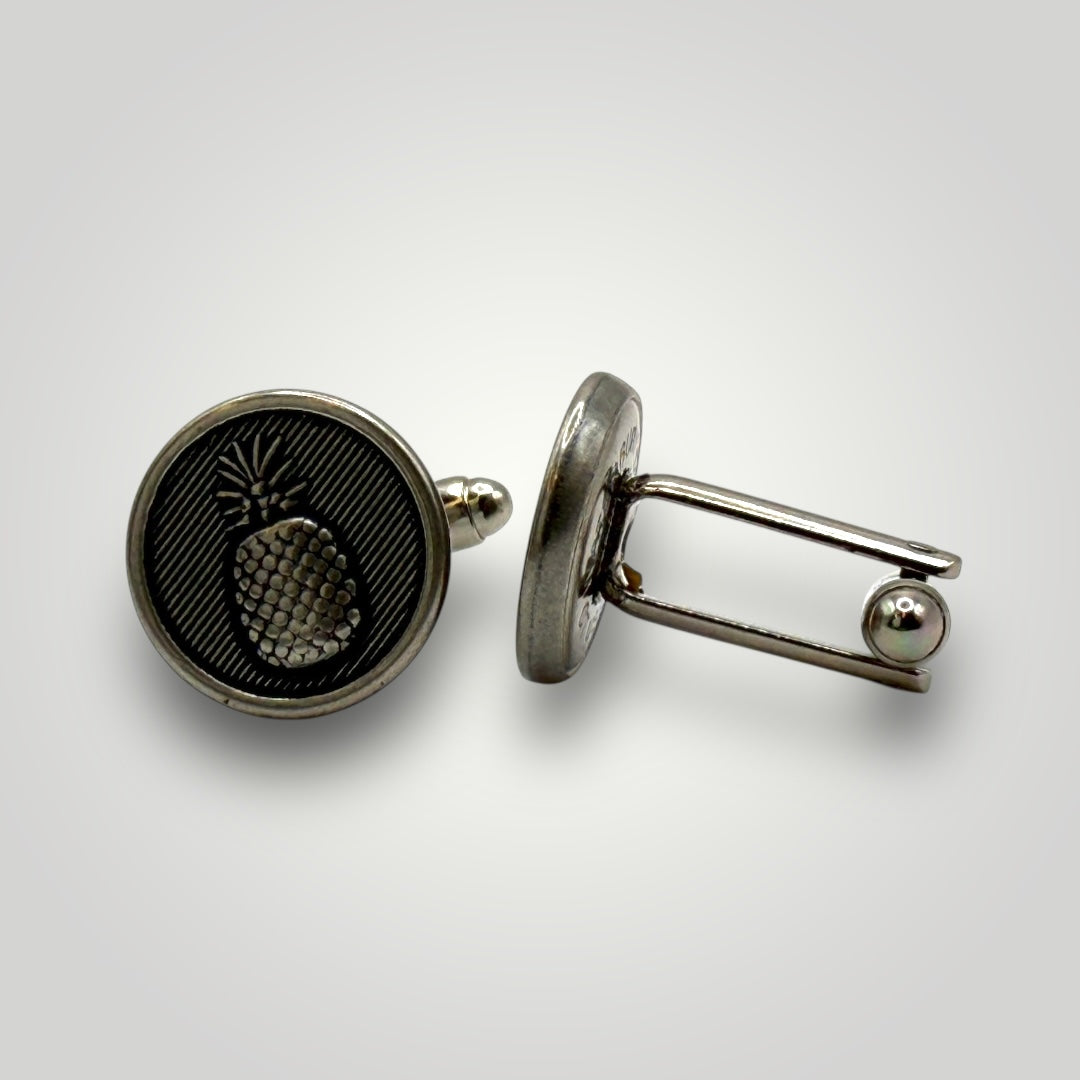 Welcome guests in style with these charming Pineapple buttons and cufflinks, featuring the timeless symbol of hospitality, warmth, and welcome. This handcrafted Waterbury Button original represents the Southern tradition of gracious hospitality and the universal symbol of welcoming friendship that makes every gathering special. Available as gold or silver cufflinks and button sets.