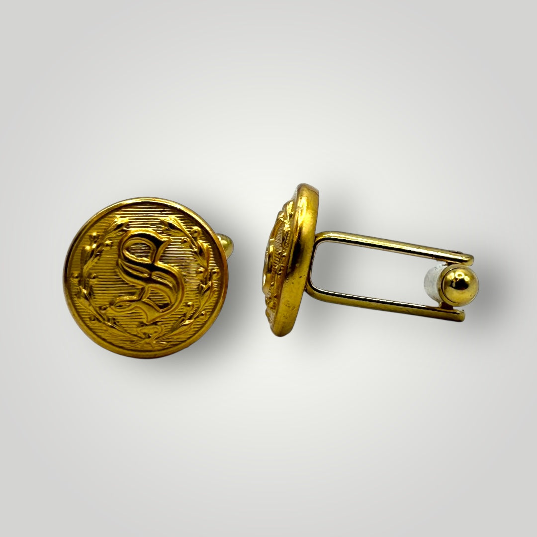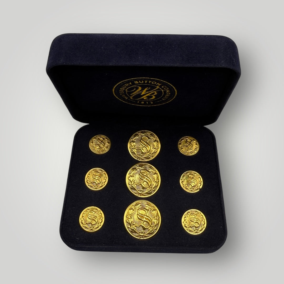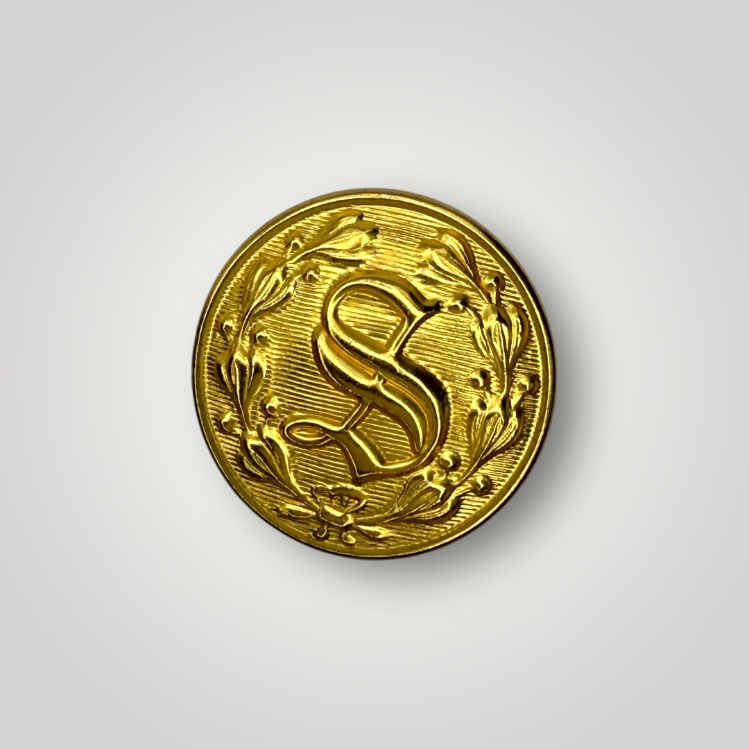 Celebrate the proud tradition of America's sheriffs with these elegant "S" buttons and cufflinks, featuring a beautifully monogrammed "S" surrounded by a laurel wreath. This iconic design is estimated to have been adopted by police departments in the late 1800's, and today adorns our Sheriff's nationwide. Handcrafted by Waterbury Button Company, these buttons honor the sheriffs who lead our law enforcement agencies with dedication, integrity, and unwavering commitment to justice. Available as gold or silver cufflinks and button sets.