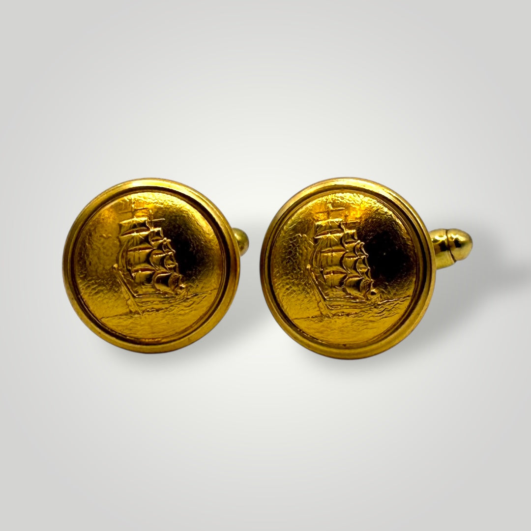 Set sail with these authentic Schooner buttons and cufflinks, featuring a handcrafted original image that has been preserved in Waterbury Button archives for many decades. This elegant sailing vessel design celebrates the golden age of American sailing and the maritime heritage that connected our coastal communities and powered early American commerce. Available as gold or silver cufflinks and button sets.