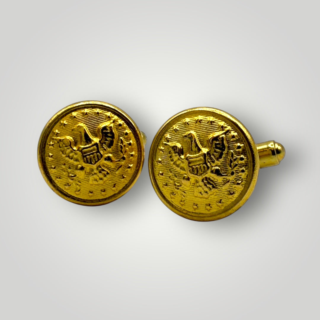 Own a piece of authentic American military history with these exceptional pre-1902 U.S. Army design buttons and cufflinks, handcrafted by Waterbury Button Company. These out-of-specification military brass buttons were General Staff buttons of the U.S. Army prior to the adoption of the Great Seal button in 1902. The current design is still used today and produced by Waterbury Button Company. This vintage piece features elements of the iconic Great Seal of the United States, showcasing a majestic eagle with outstretched wings, shield, and ring of stars - symbols of honor, duty, and unwavering patriotism. Available as gold or silver cufflinks and button sets.