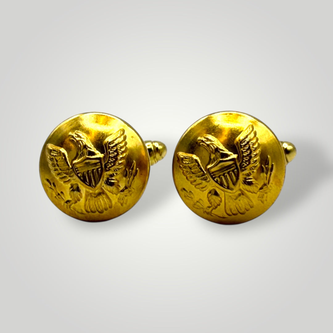Honor American history with these authentic Union Eagle buttons and cufflinks, originally designed and crafted by Waterbury Button Company during the Civil War era. These historic buttons feature the proud Union eagle emblem that symbolized the preservation of the United States during America's defining conflict. This button design adorned the enlisted service members for the Union Army. Available as gold or silver cufflinks and button sets.