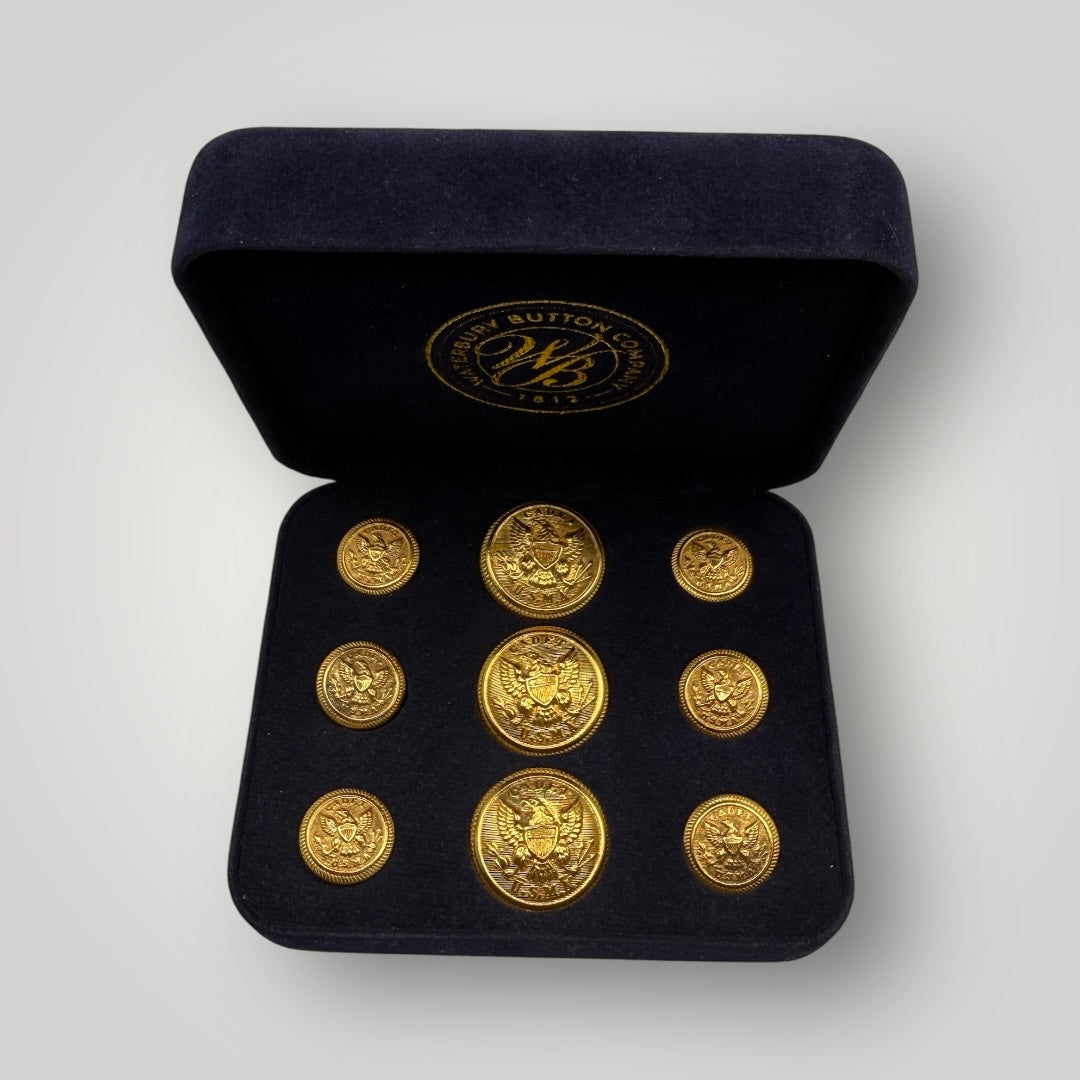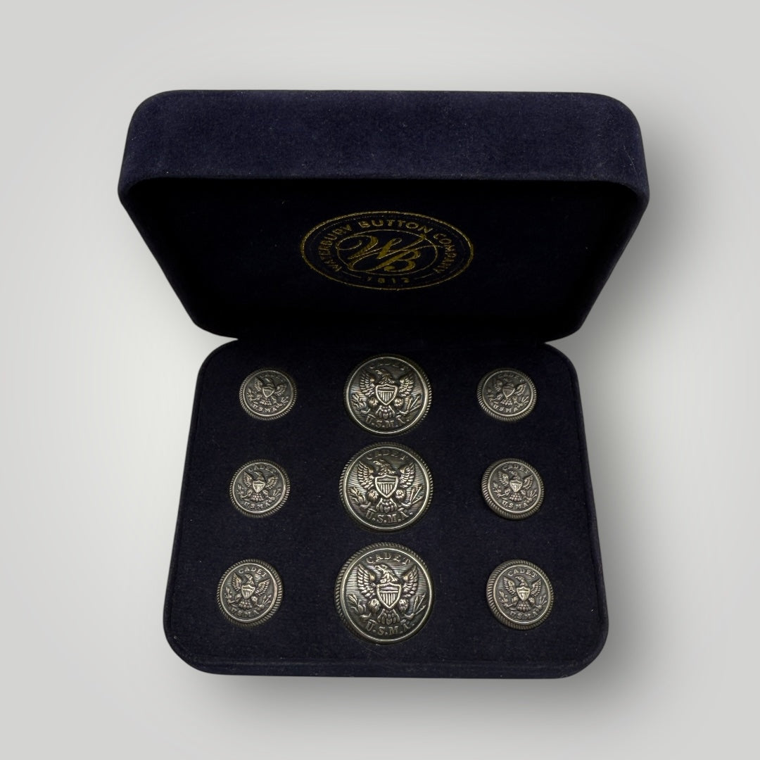 West Point Legacy: These historic cadet buttons represent the mid-20th century West Point tradition, featuring the eagle and shield symbolizing strength and patriotism, with laurel branches signifying victory and achievement.